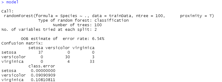 model = randomForest(Species~., data = trainData, ntree = 100, proximity = T)