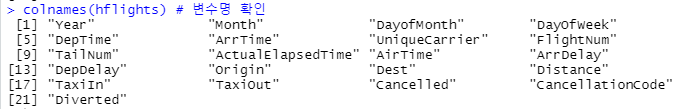 * hflights 데이터: 미국 휴스턴에서 출발하는 모든 비행기의 2011년 이착륙기록이 수록된 것으로 227496건의 이착륙기록에 대해 21개 항목을 수집한 데이터